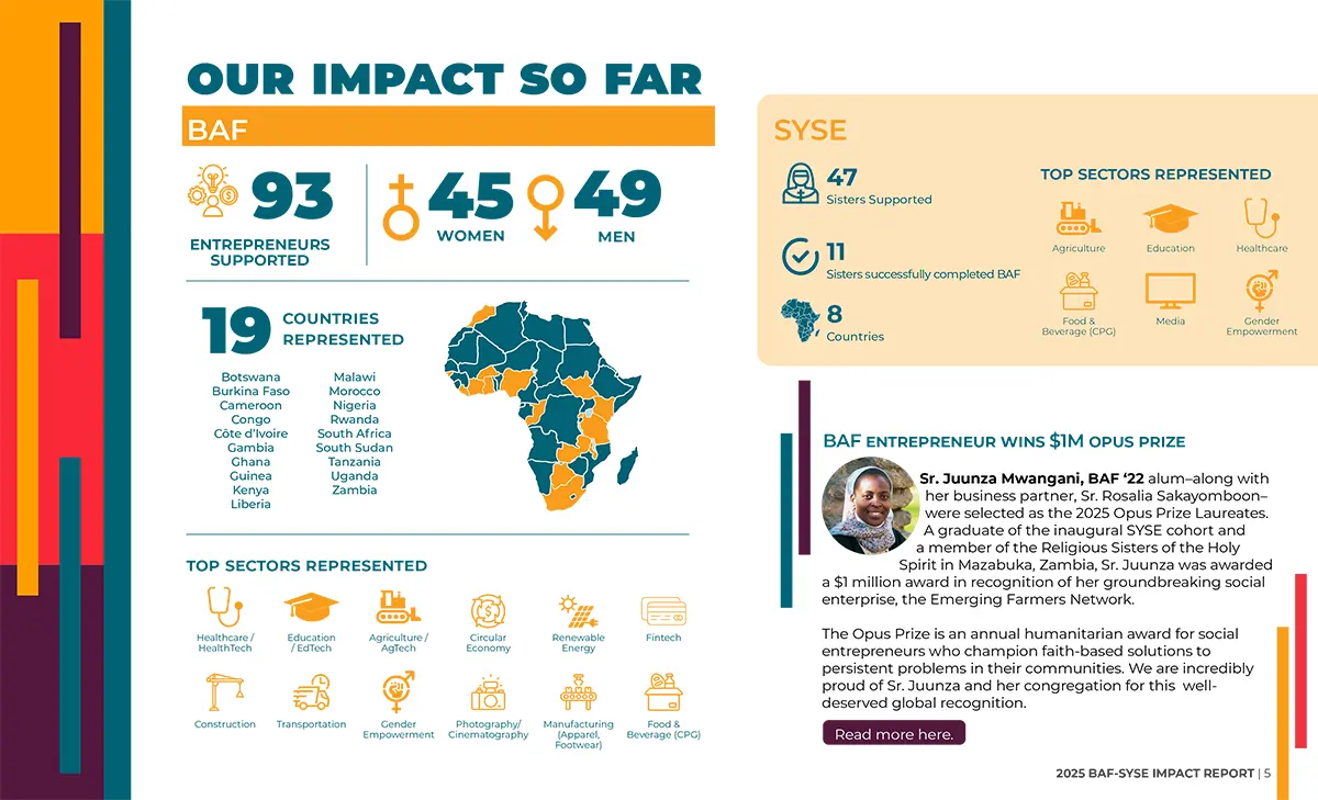 Since 2018, BAF, our flagship accelerator program has trained and supported 93 African entrepreneurs leading early-stage nonprofits and for-profit businesses, who are pioneering culturally-relevant solutions in renewable energy, healthcare, agriculture, microfinancing, sustainability, education, consumer packaged goods, and other sectors. Read our 2025 impact report here.